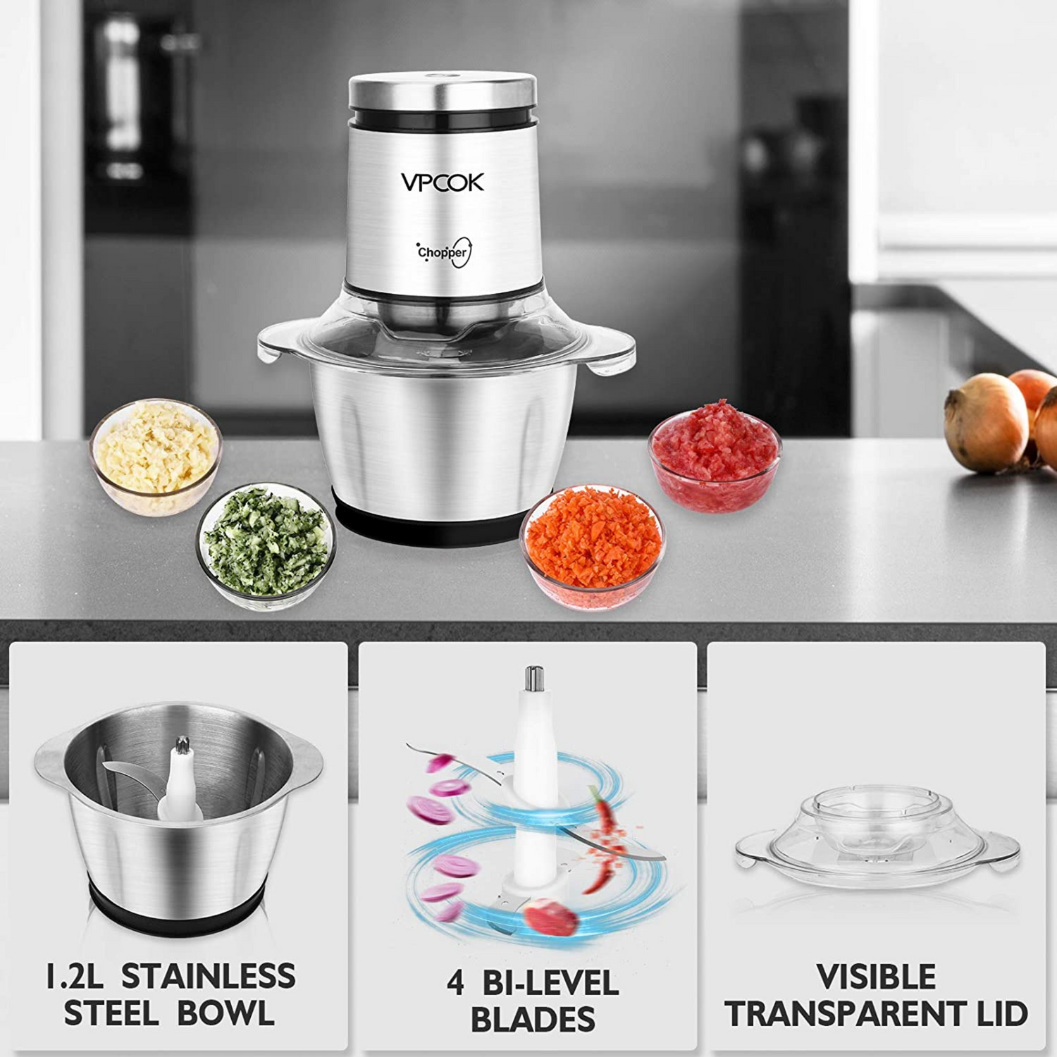 - Our electric chopper with a 1.2L capacity stainless steel bowl is durable to use for a long time. Unlike glass bowls, this stainless steel bowl is stronger, healthier and shock-proof, ensuring durability.