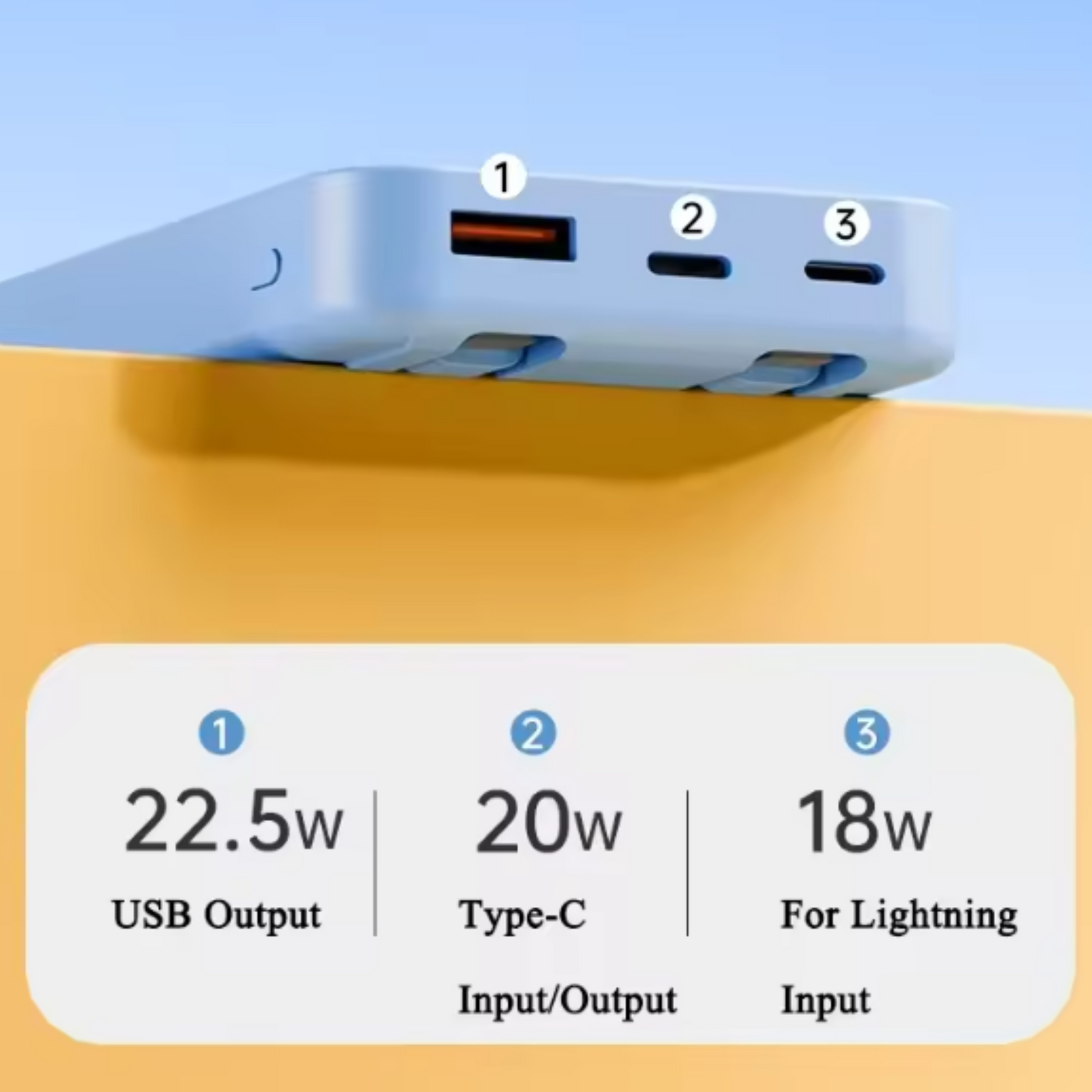 - Integrated Cables: Comes with built-in Type-C and Lightning cables, eliminating the need to carry extra cables.