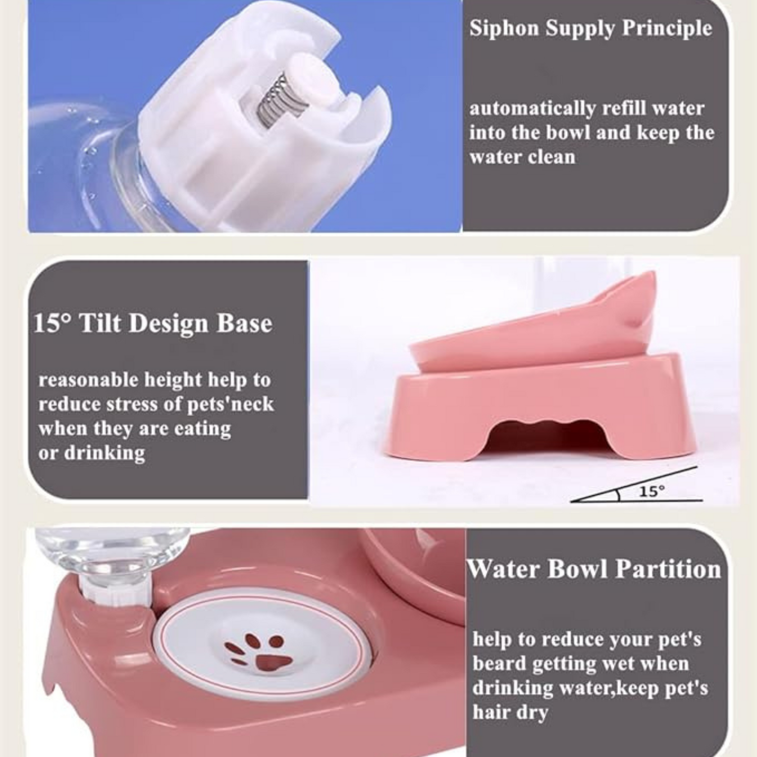 - Automatic Water Supply: The gravity siphon water dispenser ensures a constant supply of fresh water for your pet with 500ml capacity water bottle, help you save time of frequently refilling. The sink partition is designed to reduce your pet’s hair getting wet while drinking.