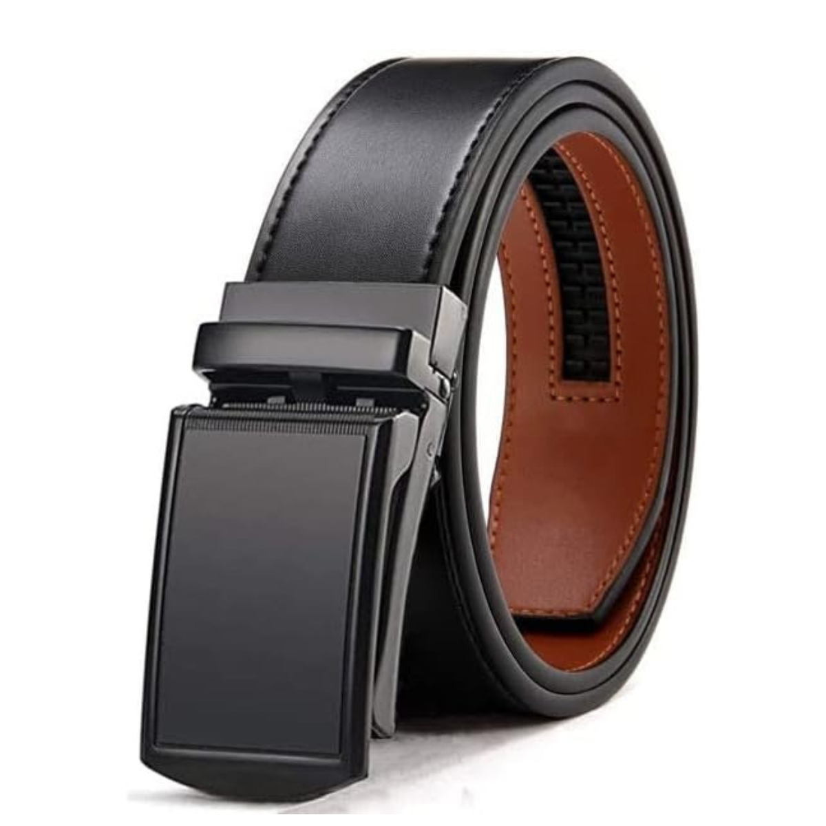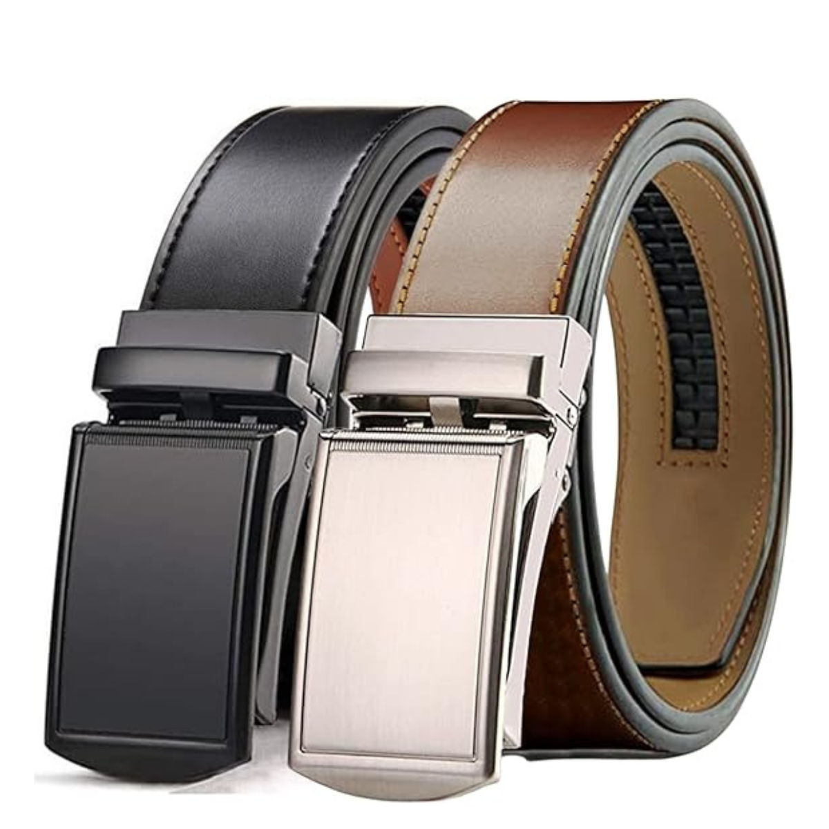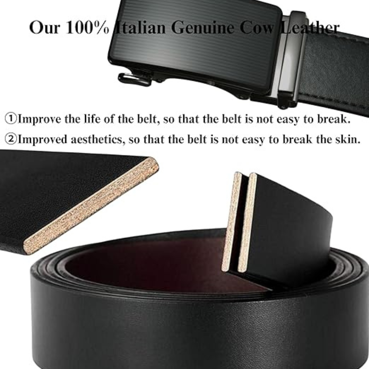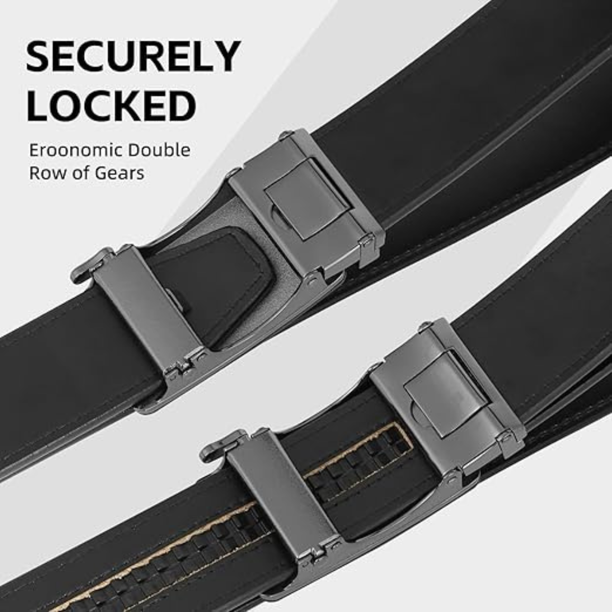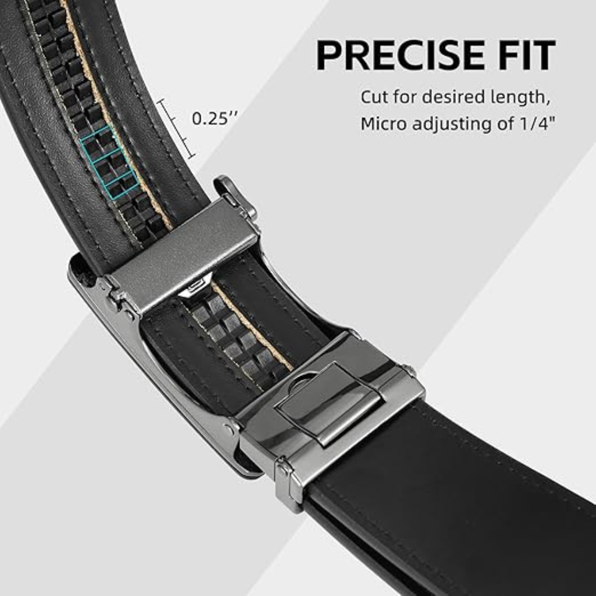 - Effortless Use- Experience ultimate convenience with our black leather belt. Simply slide it into the sliding buckle, pull it through, and let the click-it buckle automatically lock in place. Releasing the belt is just as effortless - gently push the lever on the side of the automatic buckle, and the lock snaps shut. Enjoy the seamless simplicity and smoothness of our ratchet belt design.