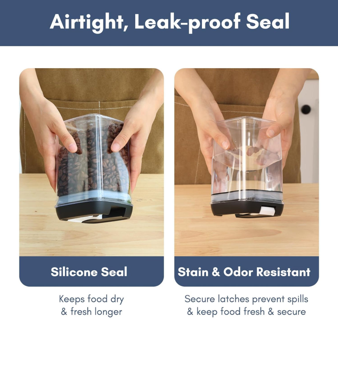 - Air-Tight to keep food dry and fresh----With special sealing mechanism, you can open or close our plastic containers safely by using only two fingers. Simply flip the ring to open or flip the ring down to lock and seal.