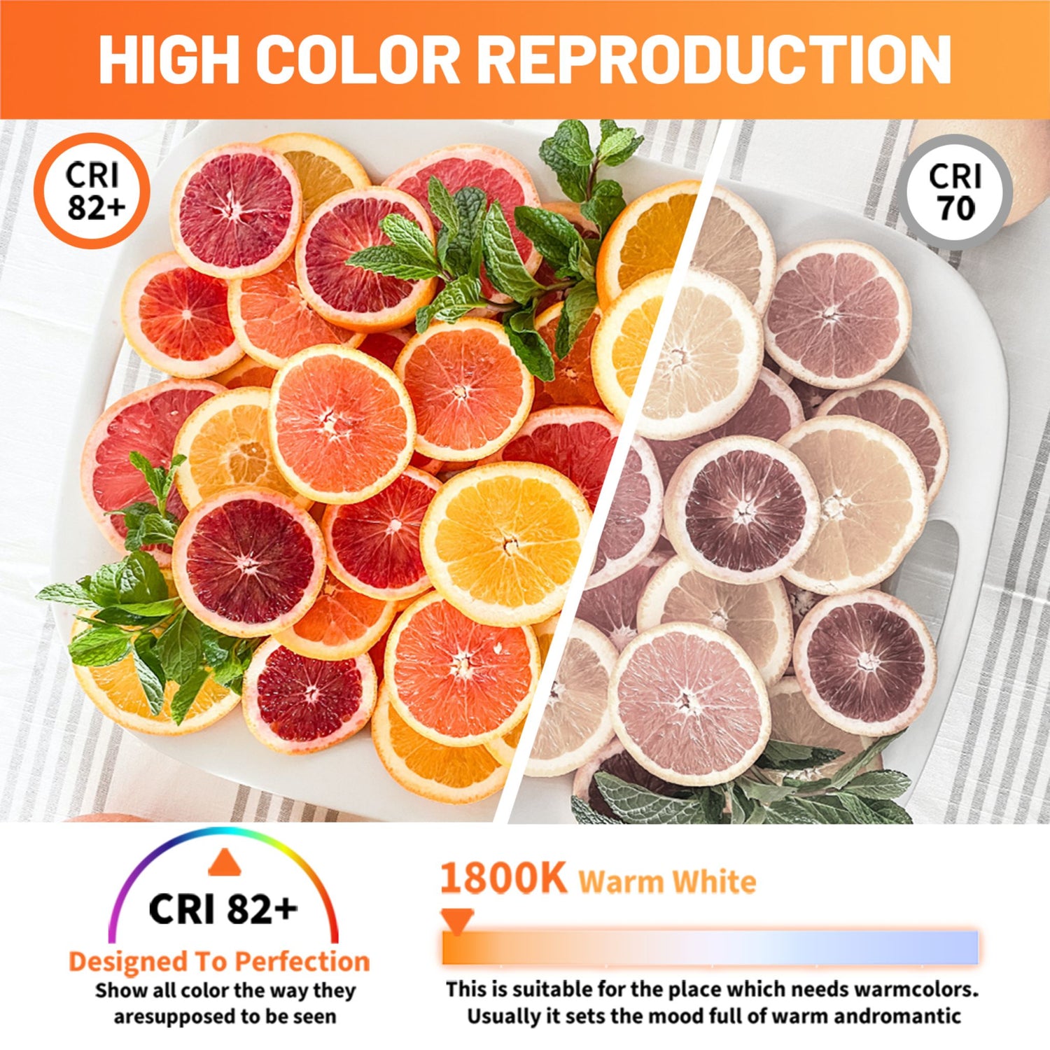 - Extra Warm 1800K Lighting – Emits a soft 1800K warm white glow that creates a cozy, relaxing, and inviting atmosphere. This extra warm color temperature is perfect for ambient lighting, helping set a calm and comfortable mood in living spaces, bedrooms, cafés, or any area where you want warm, intimate lighting.