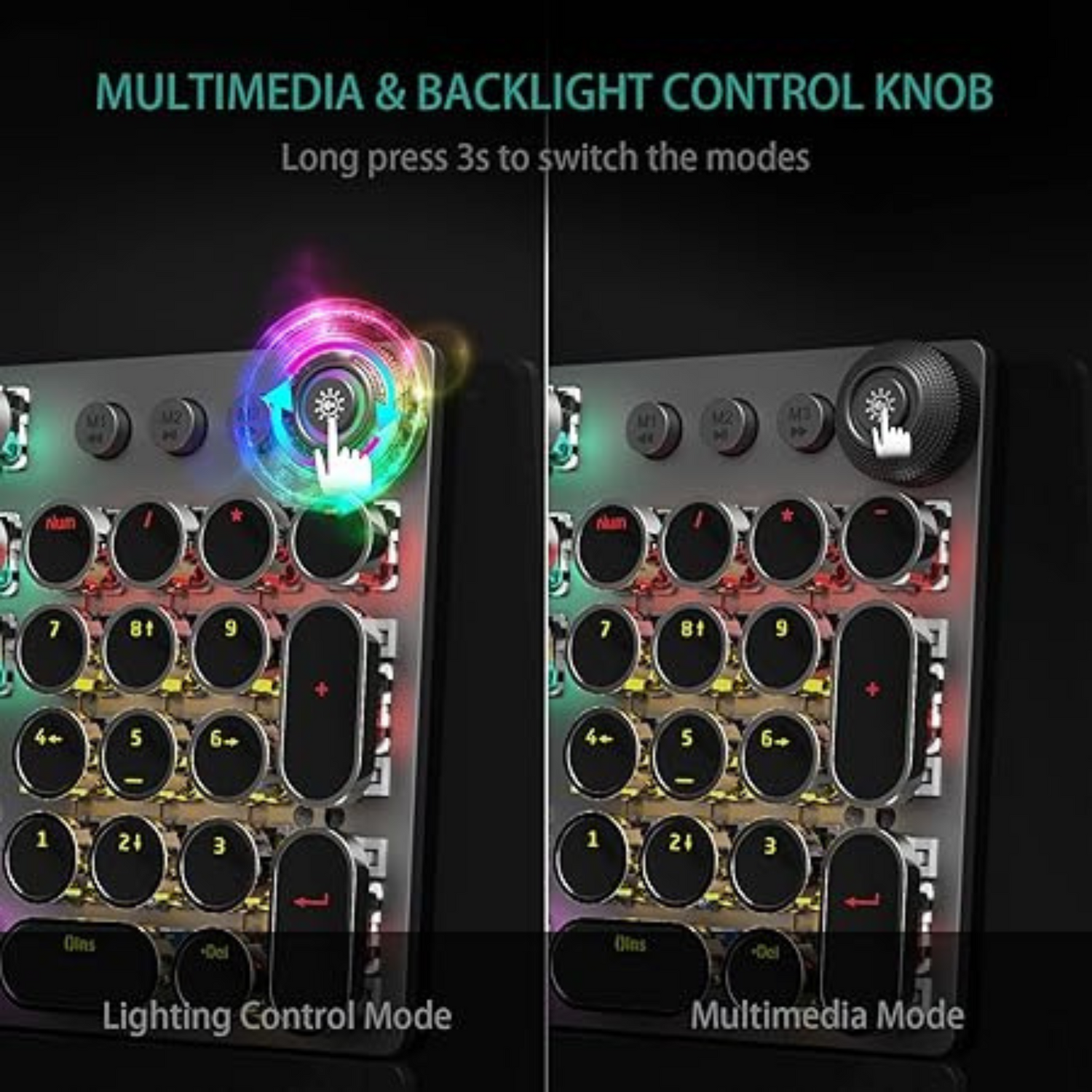 - Retro Typewriter Style Round Keycaps- Mechanical blue switch offers a quicker and springier response, crisp click sound, precise tactile feedback for ultimate gaming performance. Double-shot injection molded Vintage steampunk round keycaps for clear backlight and extreme durability, The stepped floating keycap fit your fingertips perfectly for precise positioning, prevent fatigue and wrong typing. Comes with keycap puller for easy keycaps cleaning.