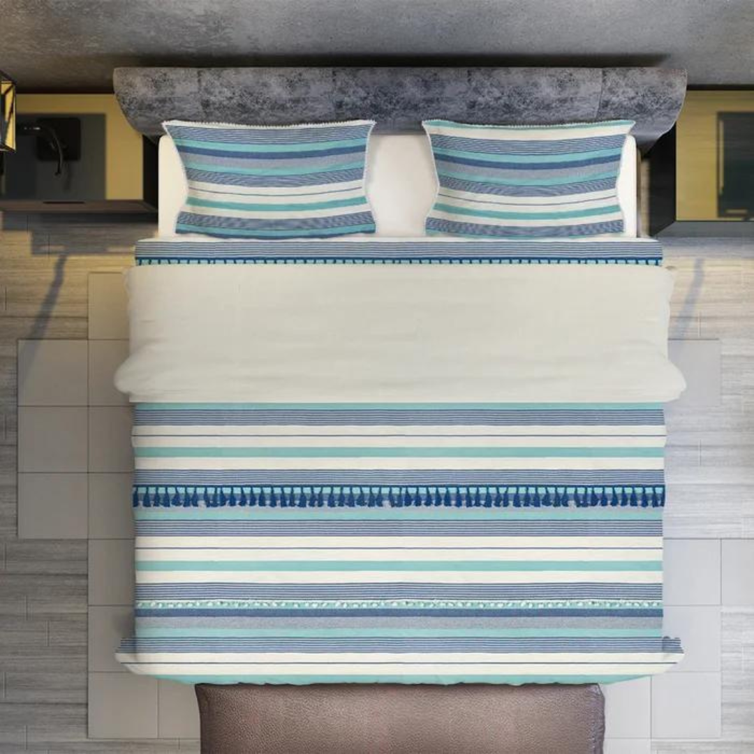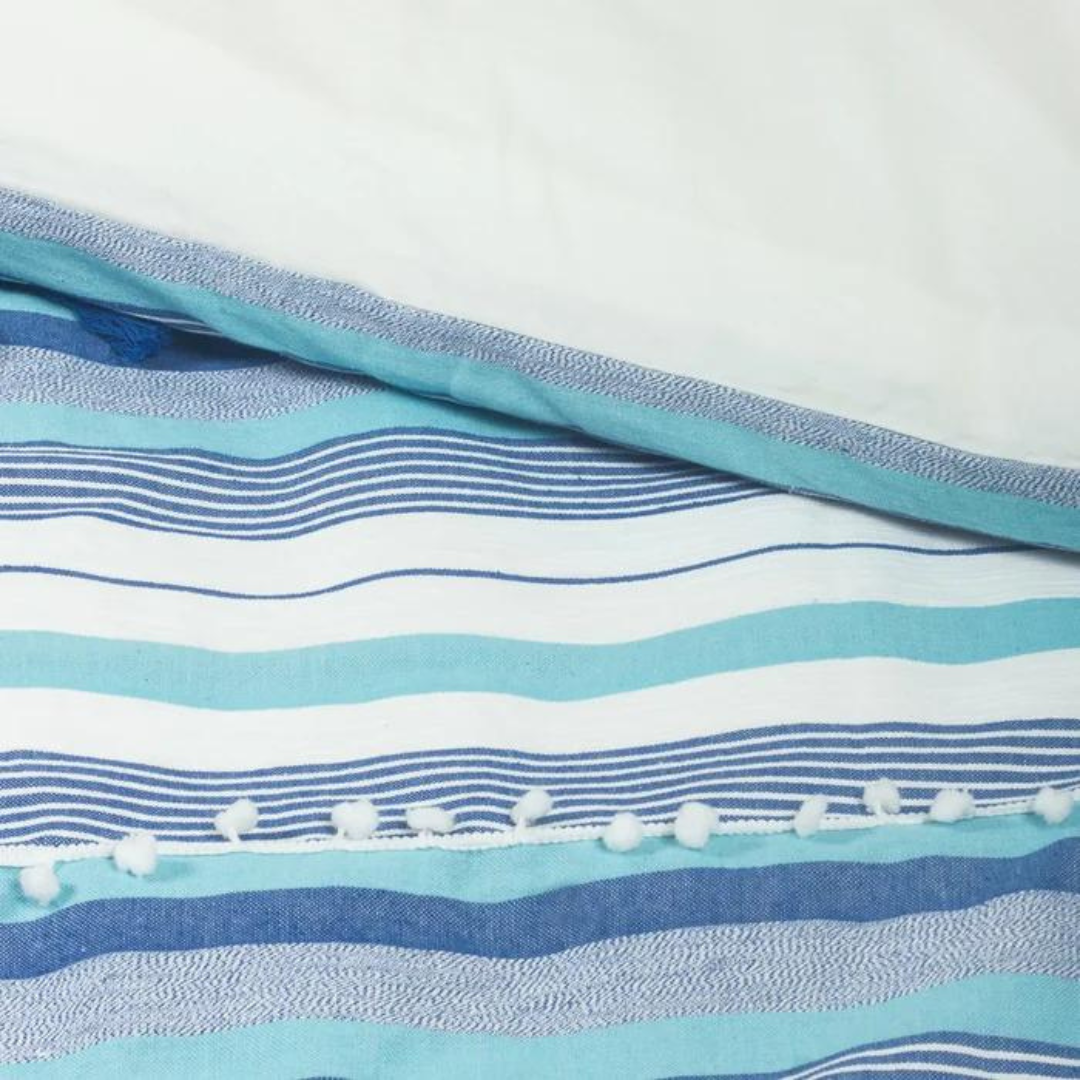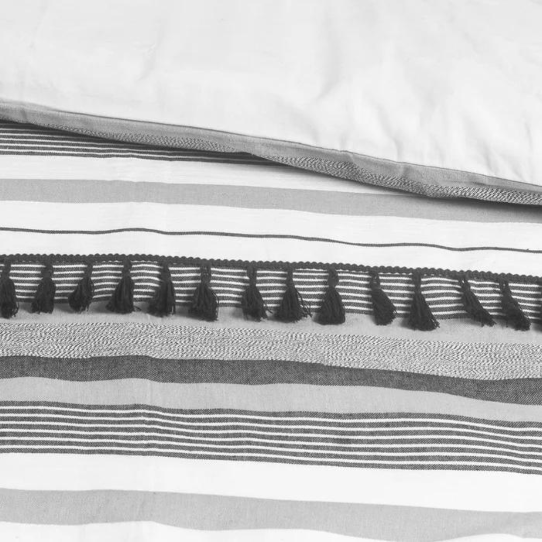 Experience exceptional style and comfort with the stripe duvet cover set. Yarn-dyed striped fabric, adorned with tassels and pom-pom lace will surely bring the cozy contemporary boho charm of your room to the next level. This duvet cover features a hidden-button closure and additional inner corner ties to secure your duvet insert in place during use.
