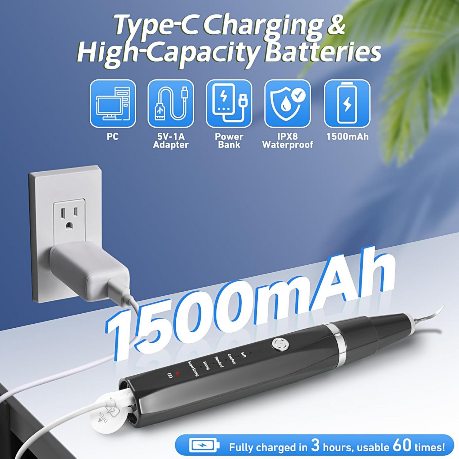 - Rechargeable high-capacity battery and IPX6 waterproof. The dog tartar remover for teeth has a built-in 1500mAh high-capacity battery powered by C-type USB. It only takes 2-3 hours to be fully charged and can work for a long time. IPX6 waterproof rating, it can be cleaned with water after used, more hygienic.