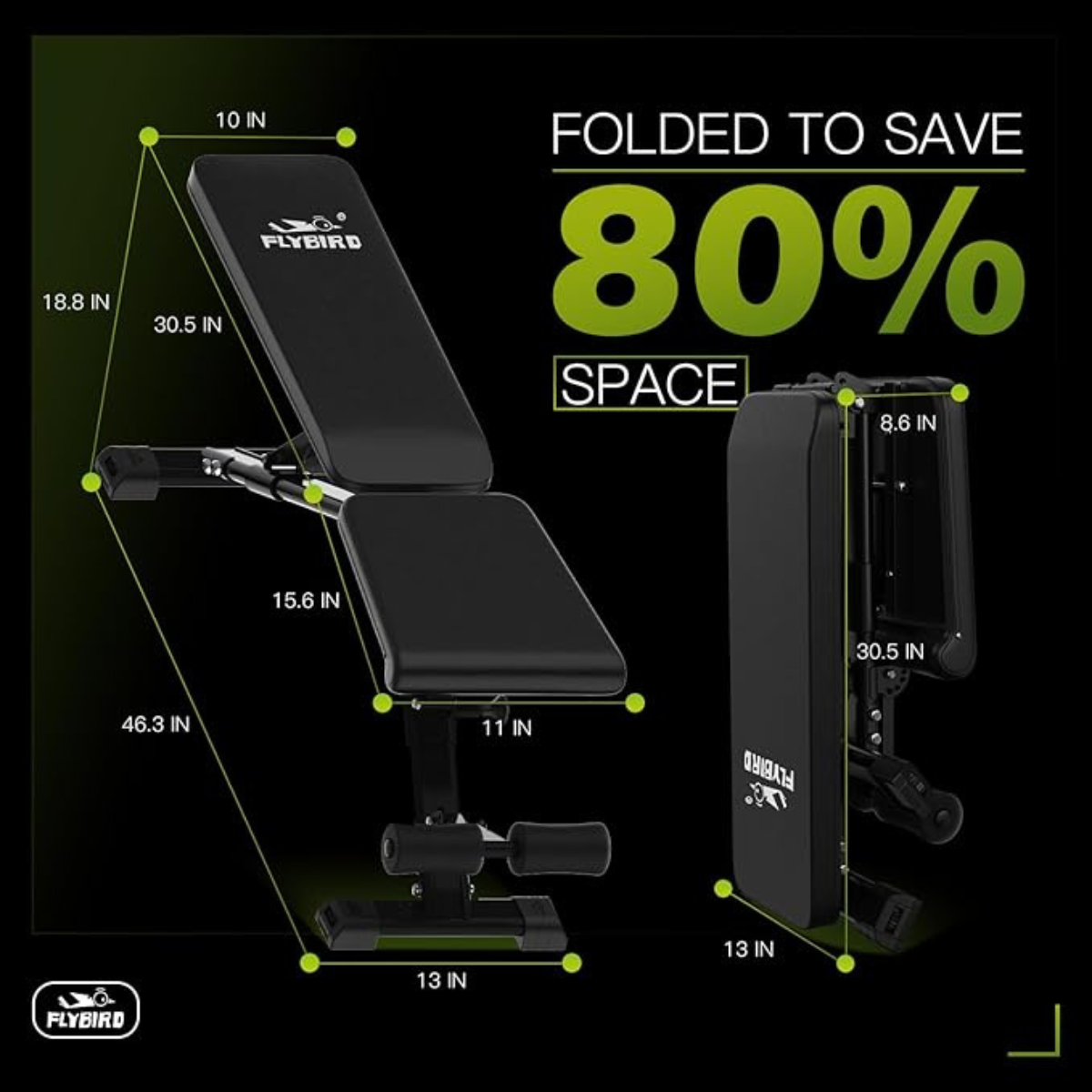- Save 80 percent space- FLYBIRD foldable bench, easy to carry and no assembly needed, folded size 30 inch long 16 inch wide 9 inch high; You can put it in the corner or under the bed when you finish workout