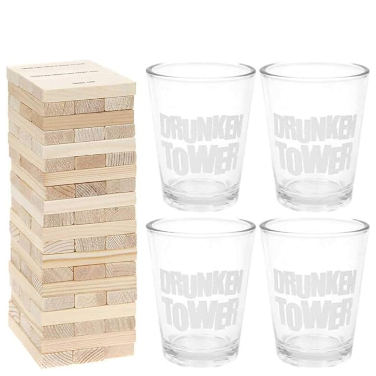 - Material - The drinking game set consists of 60pcs natural stacking wooden blocks and 4pcs shot gl.