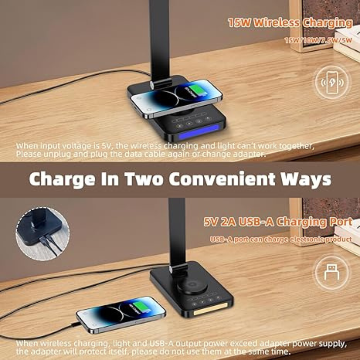 - LED lamp that supports mobile phone charging - Wireless fast charging desk lamp with a wireless charging platform, compatible with most wireless charging Android and Apple mobile phones with 10w wired charging function. The desk lamp also supports wired charging and provides an additional USB interface for use. Wireless fast charging power is 15W/10W/7.5W/5W, USB maximum 5V 2A.