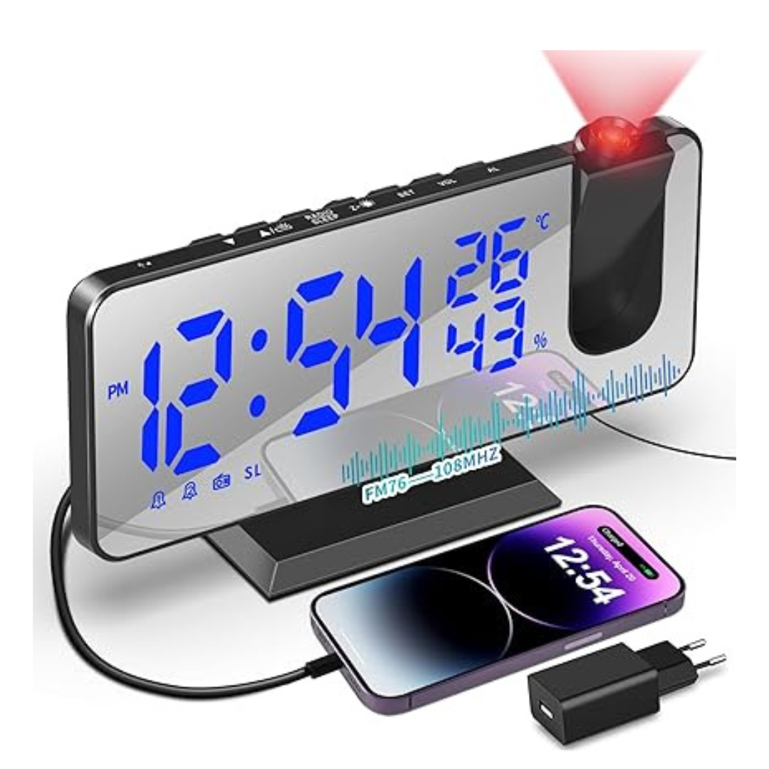 - USB-connection and snooze mode: you can use this alarm clock by connecting it to a power supply via USB. (The plug is not included.) On the back of the projection alarm clock there is also a USB output that can be charged via mobile phones and tablets. With the snooze function, you can sleep another 5 to 60 minutes (by default 5 minutes) before being remembered.
