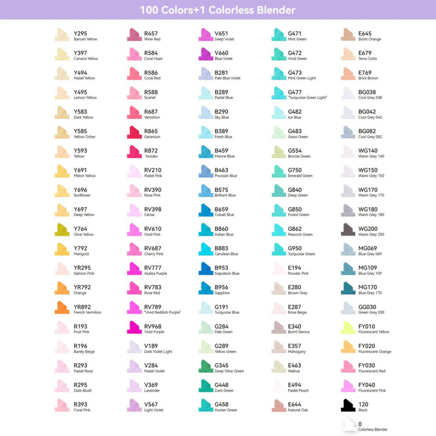 - 100 VIBRANT COLORS + 1 COLORLESS BLENDER : Add dimension to your art with the superior blendability of dye-based ink. The set includes 100 unique, brilliant colors and a colorless blender for endless creativity, which is a must-have working tool in many fields of design, illustration and fine art