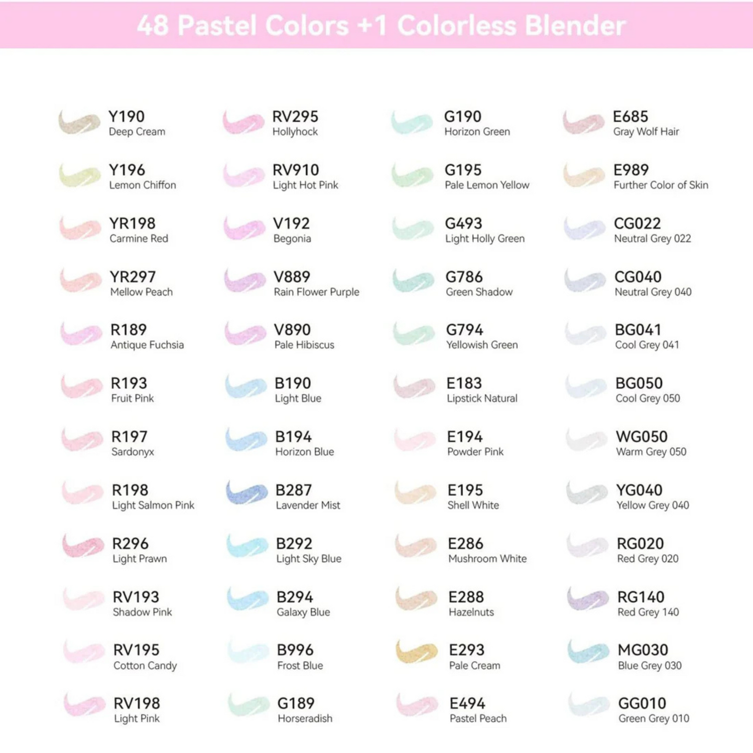 - 48 PASTEL COLORS + 1 FREE BLENDER : The rainbow is at your fingertips- choose from 48 brilliant pastel colors and bring your ideas to life. The color spectrum is yours to explore with 48 brilliant pastel shades to choose from, plus a colorless blender for better blending effects. From coloring books to professional masterpieces, our art markers will breathe life into your artwork
