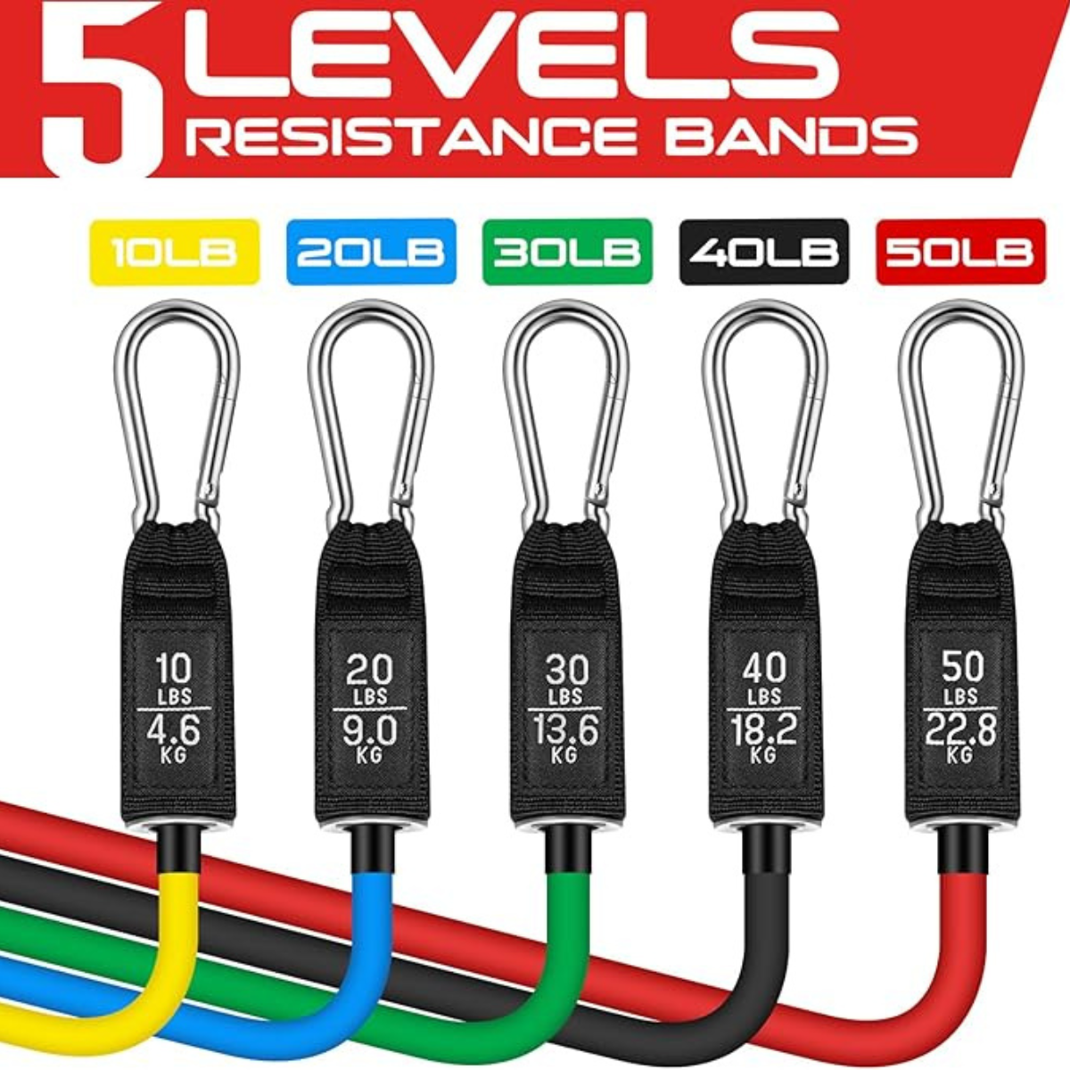 - Adjustable Resistance Bands Set: 5 resistance levels, Light pink (10 lbs), Pink (20 lbs), Green (30 lbs), Grey (40 lbs), Black (50 lbs). Stackable exercise bands, both in 51", maximum resistance is 150 lbs.