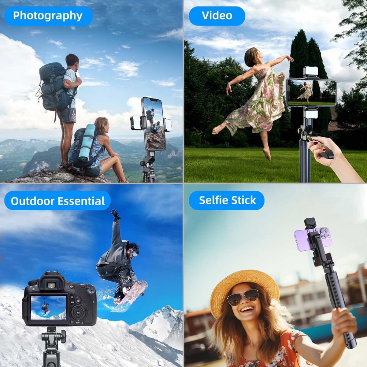 - Selfie Stick Tripod with Remote- phone tripod with remote is also a selfie stick that supports wireless photography and is equipped with a wireless remote control to easily achieve remote shooting. Not only is it a selfie stick for iPhone, also compatible with any smartphone such as Android and Samsung. Allows you to shoot at longer distances. Recommended to be used within a 40ft range.