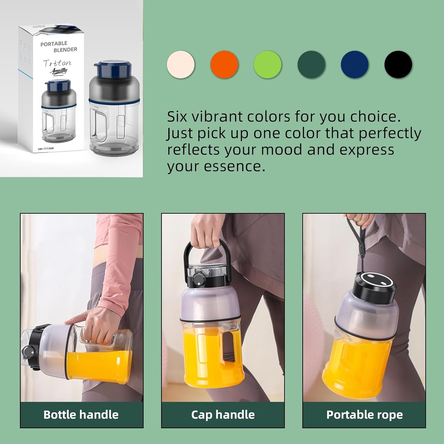 - 2 in 1 Juicer + Sports Water Cup- This is an amazing Personal size Blender Bottle for multiuse: a 50 fl.oz Water Cup + a 33.8 fl.oz Fresh Juice Portable Blender. Newly launched with the following features: Portable, Wireless, Large Capacity, Super Power with 10 PCs Sharp Blades. It makes juicing so much easier! Just put any vegetable/fruits/milk/ice you like into it, and it will conjure a beverage of your liking, not to mention all in a cool bottle jug that’s ergonomic and stylish.