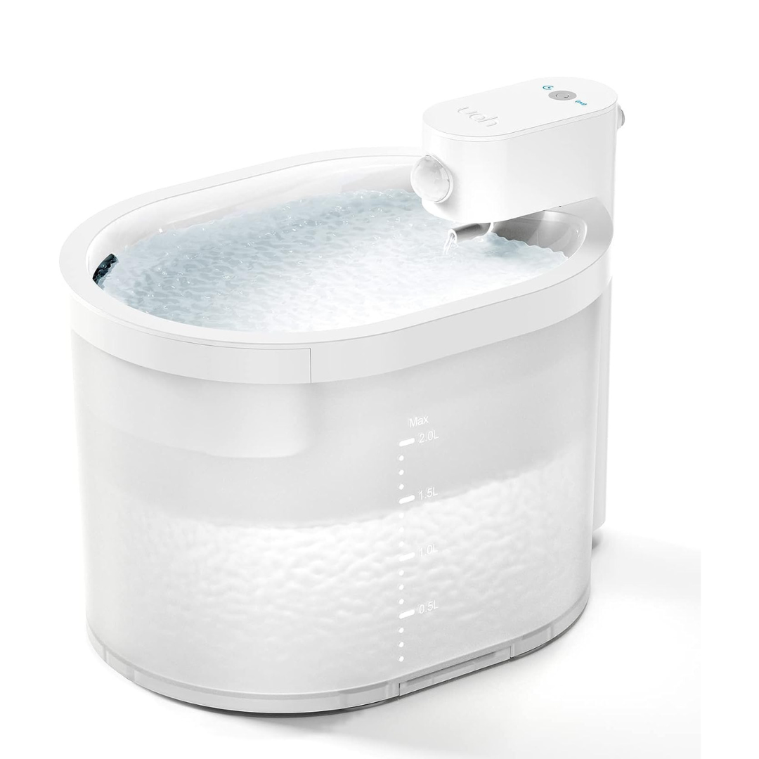 - MORE SCIENTIFIC—No Touch Bottom & Whiskers Fatigue: It like a small pond. Prevent fatigue by whiskers touch edge of tray, water tray capacity up to 200ml and wide 5.5inches. Prevent cats' tongue touch bottom, It avoid makes cats worry about drinking unclean water by deep 0.39inches. The separation of water and electricity allows fountain capacity to real achieved 2L (67oz). Allow cats or small dogs to "binge drink" for 10 days.